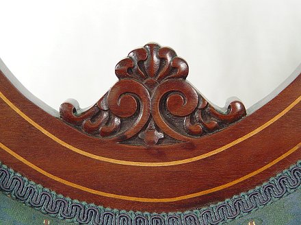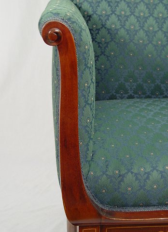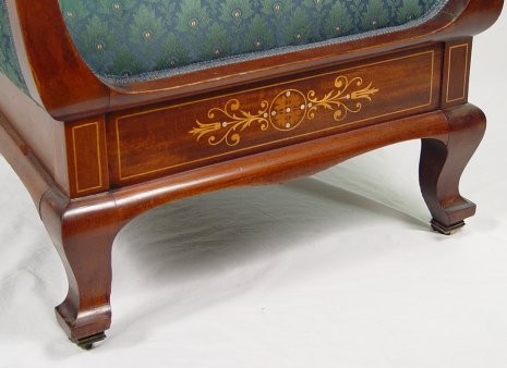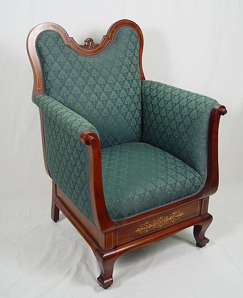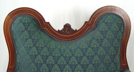 19th C INLAID MAHOGANY PARLOR CHAIR: Tall back and tall arms. String inlay follows the lines of the sloped crest, parquetry inlay on the skirt. Newly upholstered. 43 1/2''h, x 29'' x 25''.