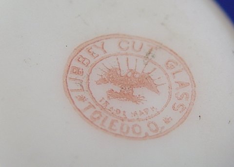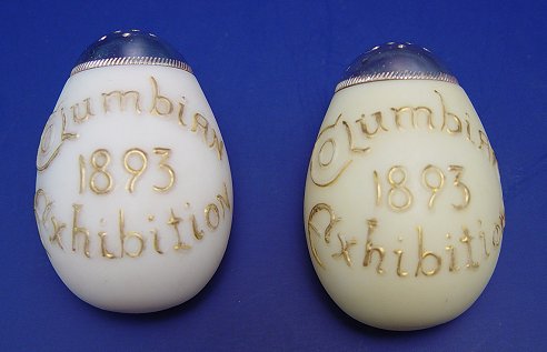 EARLY LIBBY EGG SHAPED 1893 EXPOSITION SALT & PEPPER: For the Columbian Exposition of 1893. Signed with the red Libby stamp. Approx. 2 3/4''l. Est. $400/700**