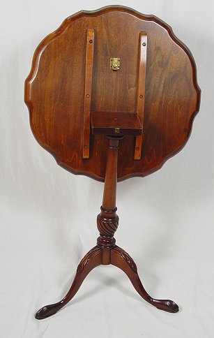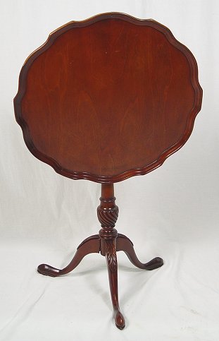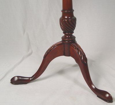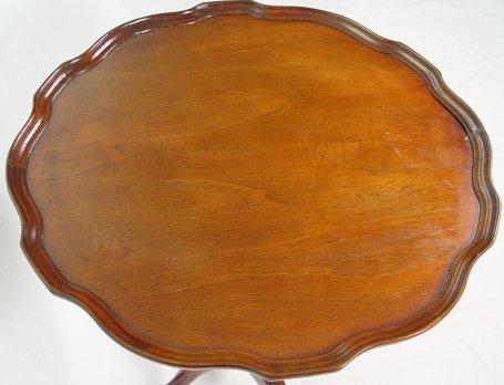TILT TOP MAHOGANY TEA TABLE: Pie crust edges, carved pedestal, slipper feet. 26 3/6''h. 23 1/4'' dia.
