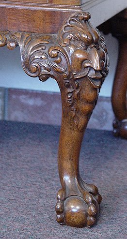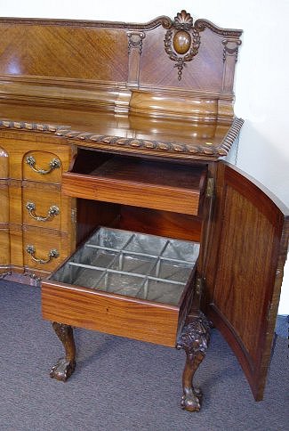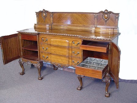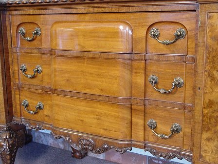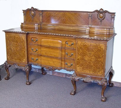 SUPERIOR CHARLES WALLACE & SONS MAHOGANY SIDEBOARD: Gadrooned molded top, masquerons and shell carving to cabriole legs ending in claw & ball feet, banded doors with inset panels of burl. Late 19th, early 20th C. 55''h, x 79'' x 27''. Est. $3000/4000**