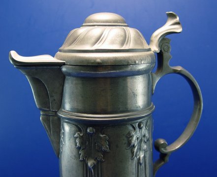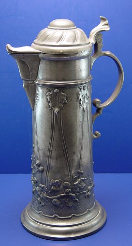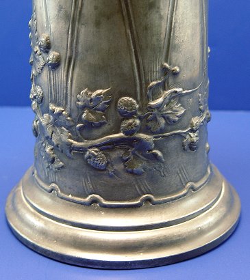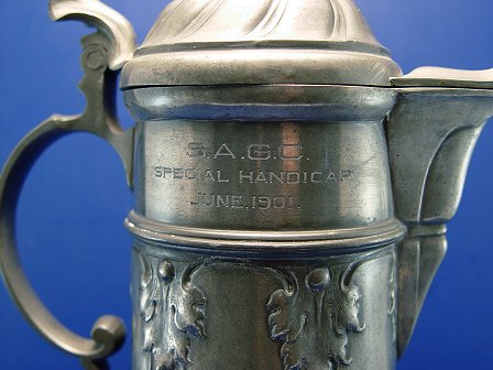 1901 ART NOUVEAU PEWTER TANKARD GOLF TROPHY: Embossed naturalistic leaf motif. Engraved ''S.A.G.C. Special Handicap June 1901''. Hinged lid. 14 1/2''h.