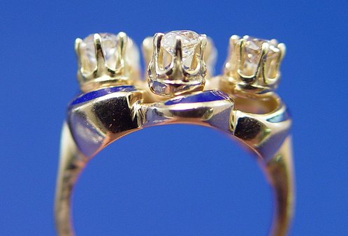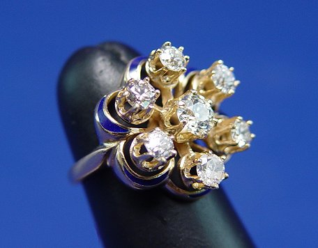 VICTORIAN DIAMOND ENAMEL RING: Seven sparkling stones set in an open floral motif with bright blue enamel trim to each petal, center stone approx. 1/2ct with approx. 1.5ctw in diamonds. 14k yellow gold setting, size 5.25, 6.5 grams. Est. $800/1000**
