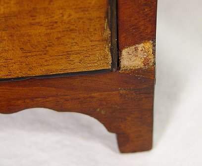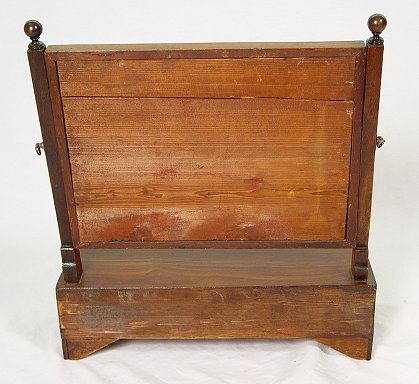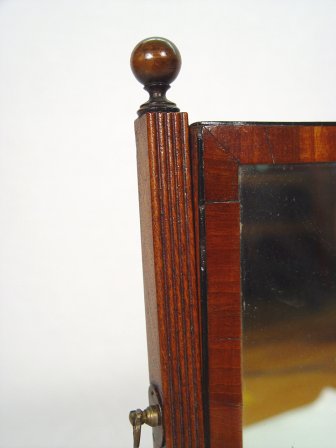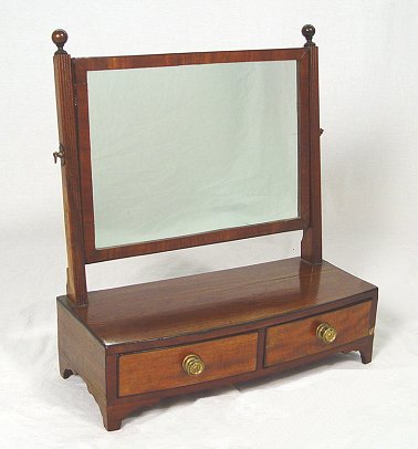 19th C GENTLEMAN'S SHAVING OR DRESSING MIRROR: Mahogany mirror on 2 drawer bow front stand. Mirror swings between reeded supports with ball finials. Minor veneer loss. 19 1/2''h, 17 1/2'' x 7''.