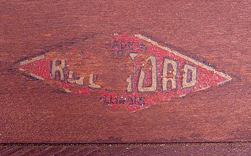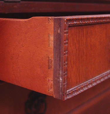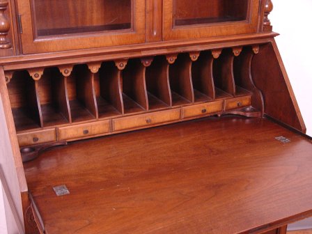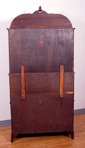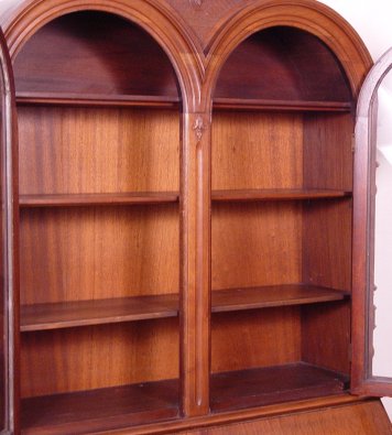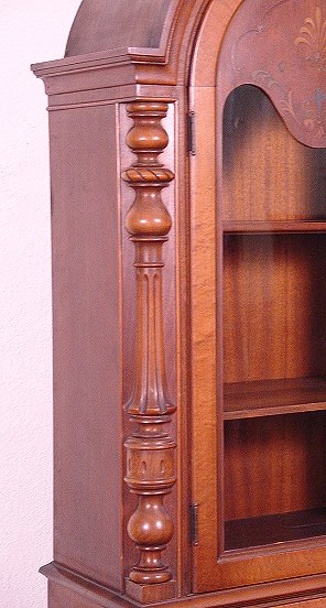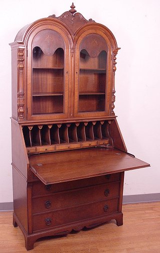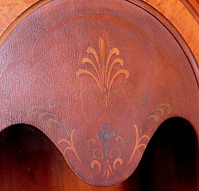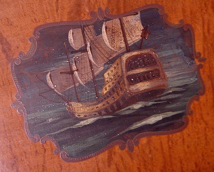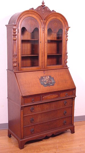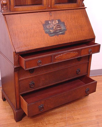 PAINT DECORATED MAHOGANY SECRETARY BOOKCASE: American manufactured by Mechanics Furniture of Rockford Ill. Featuring carved crest, turned stiles, arched doors, painted design to the top and painted image of a tall ship on the slant front of the desk. 6'8''h. x 38'' x 18 1/2''.
