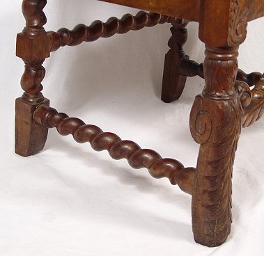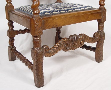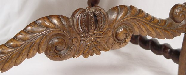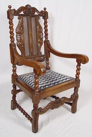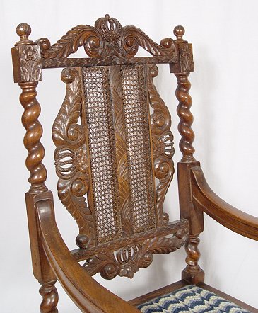 CARVED THRONE CHAIR: Carved and cane back with crown at the crest. Spiral stretchers, arm supports, and stiles. Needlepoint seats. 47 1/2''h. x 24 1/2''w. x 20''.