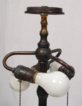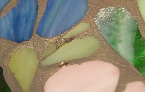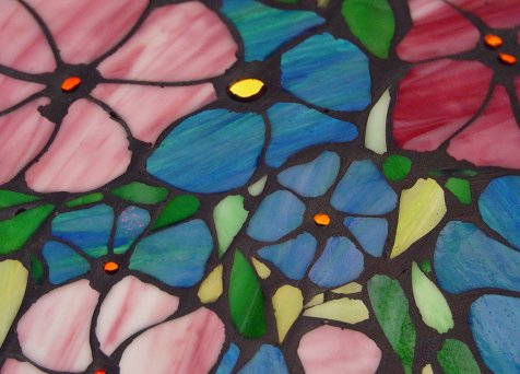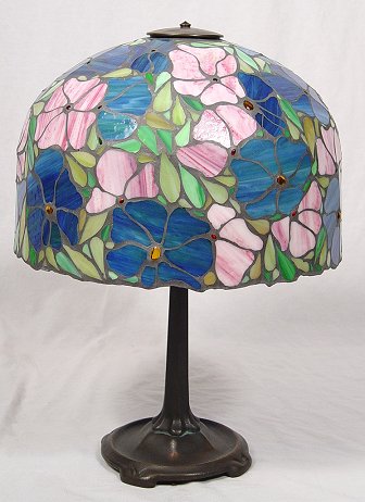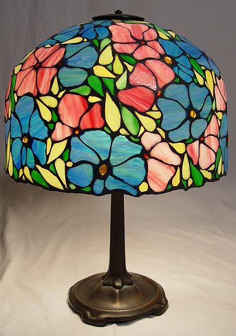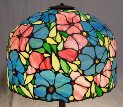 FLORAL LEADED GLASS LAMP: Domed shade of pink and blue open petal flowers. Shade is 23'' dia., lamp is 17''h. Contemporary.