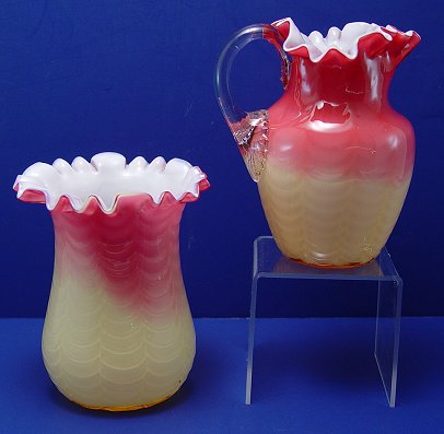 WHEELING GLASS PEACH BLOW ''DRAPE'' PITCHER AND SPOONER: Hobbs, Bruckinier & Co. glossy finish Peach Blow colored crimped top pitcher, 5''h, and matching spooner 5'' h.