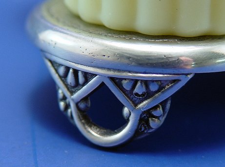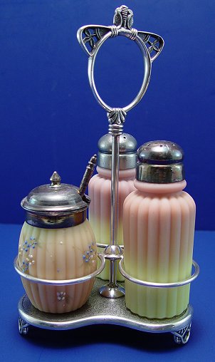 MOUNT WASHINGTON BURMESE GLASS SALT, PEPPER AND MUSTARD IN PAIRPOINT HOLDER: Pillar ribbed, Burmese glass shakers with mustard pot and spoon. The pot has enameled floral decoration. Signed Pairpoint stand numbered 723. 7 1/2''h.