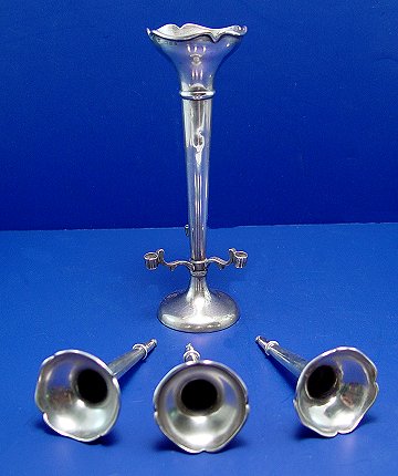 PAIR OF ENGLISH SILVER EPERGNES: Trumpet vase plus three arms with removable vases. Hallmarks indicate 1926 London, makers Charles & Richard Comyns. 7 1/8''. Monogram R., weighted. Please note slight dent at base of one.