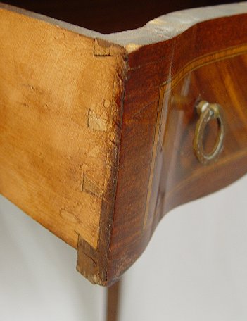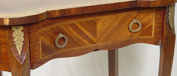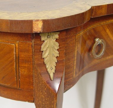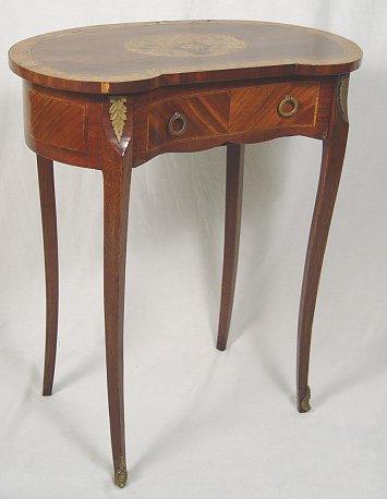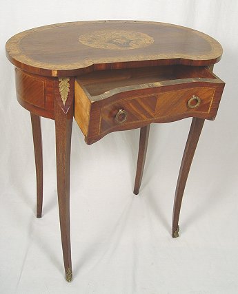 19TH C FRENCH MARQUETRY STAND: Ormolu mounted kingwood marquetry stand. One drawer under a kidney shaped top with charming inlay design of a flower filled basket. A wee bit of loose veneer. 29 3/4''h. x 25 1/2'' x 15''.