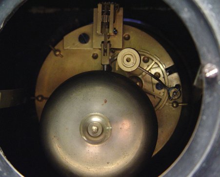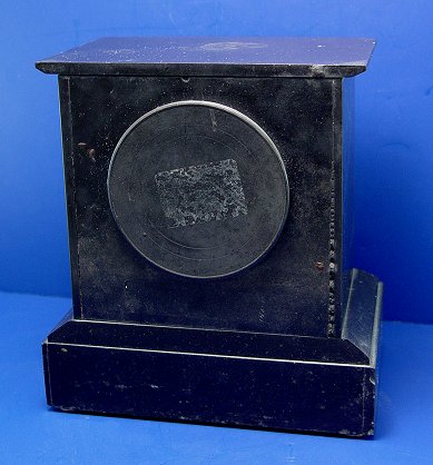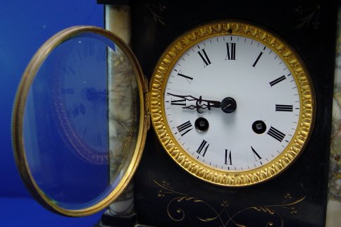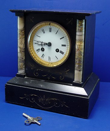 ADORABLE BLACK MARBLE MANTLE CLOCK: Variegated marble columns and scrolling etched decoration to front, with key and pendulum, chip to front corner, no mark found, 8 1/2''w. x 5 1/2''d. x 9''h.