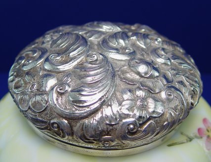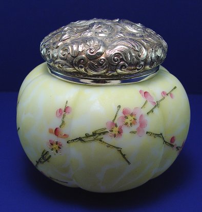 MT WASHINGTON MELON RIB HUMIDOR: Melon ribbed glass with flower blossom decor. Embossed silverplated lid. 5 1/2''h, 6 1/4'' dia.