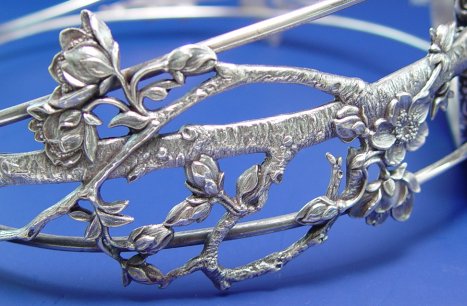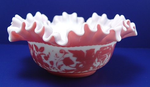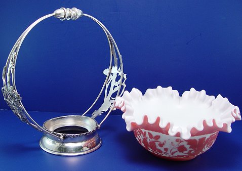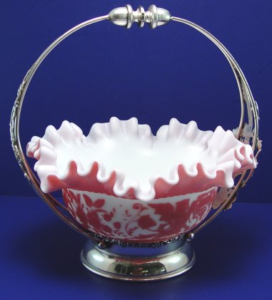 MT WASHINGTON CAMEO GLASS BASKET IN SIMPSON HALL & MILLER FRAME: Pink on white griffin design, crimped edge bowl in a period Simpson Hall & Miller silverplated basket frame in a tree motif. The bowl is 9'' dia., the basket is 11''h, overall.