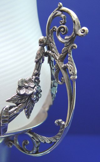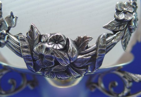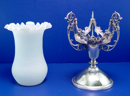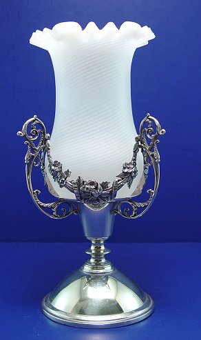 MT WASHINGTON SWIRL ART GLASS CELERY IN A PAIRPOINT FRAME: Swirled satin glass, ruffle rim celery vase in an ornate, signed Pairpoint holder, #1303. 11 1/4''h. overall, vase is 5'' dia.