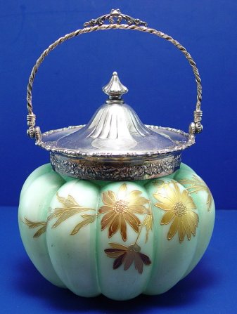 MT WASHINGTON DAISY BISCUIT JAR: Gold design on melon ribbed glass, silverplated lid and handle.