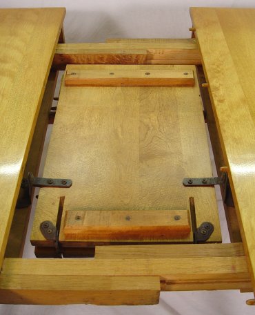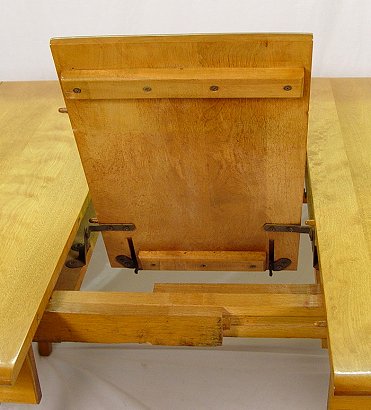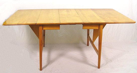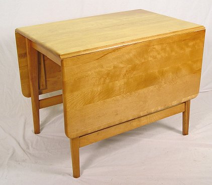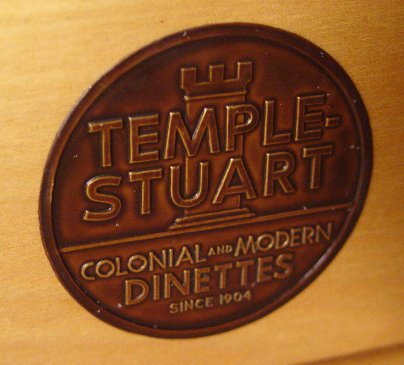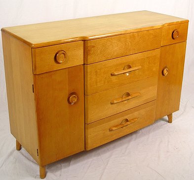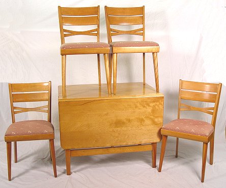 TEMPLE STUART MODERNE DINING SUITE: Drop leaf table, 4 chairs and a sideboard. The table is 38'' x 73'' when opened, including the 12'' hidden leaf. The sideboard is 34''h, 18'' x 48''. Excellent condition. Very Heywood Wakefield looking.