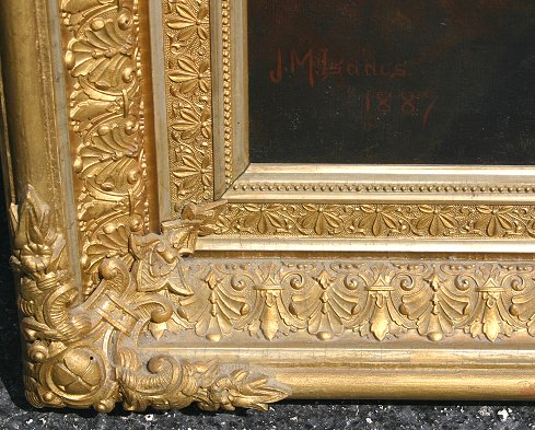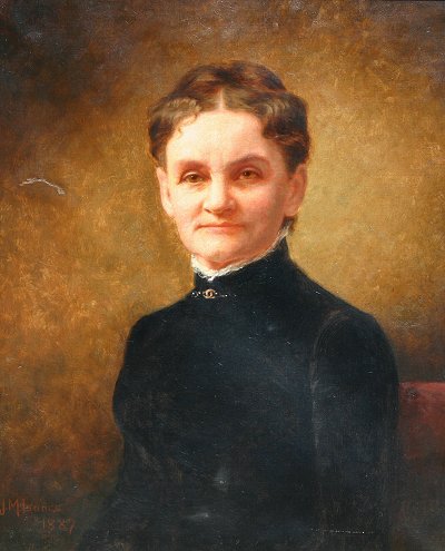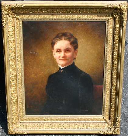 ISAACS, Jessie M., (American, 19th C.): Portrait of a Woman, 27'' x 22'', O/C, exceptional restored period frame with wear, 37'' x 32'', SLL, dated 1887, signed verso with artist's address, Carl Herzog & Co label. Condition - Patches verso, inpaint, good overall, needs a little work.