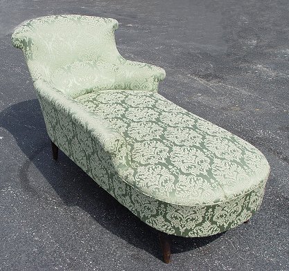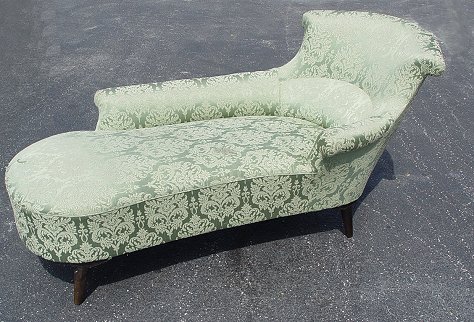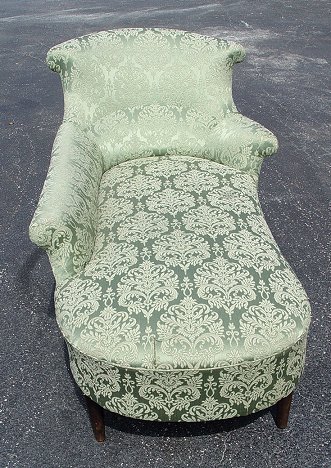 GLAMOROUS ITALIAN 1920'S CHAISE: Asymmetrical arms, slightly scrolled back, straight tapered legs. Please note tear in the fabric near the foot. 72''l, x 33'' x 34''.