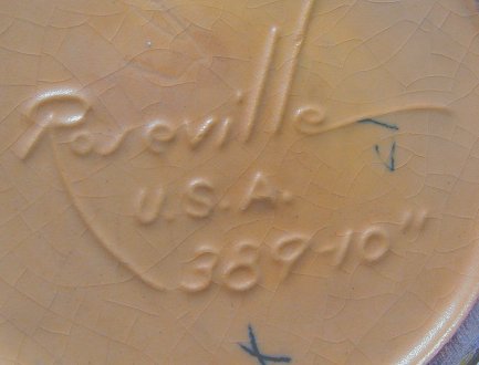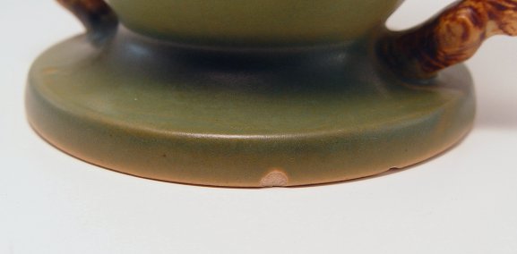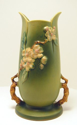 ROSEVILLE POTTERY APPLE BLOSSOM VASE: Green, #389-10, 10''. Please note chip on base.
