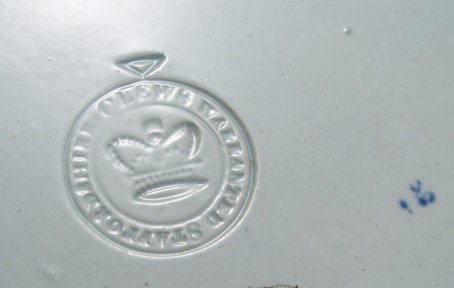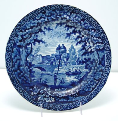 JAMES & RALPH CLEWS STAFFORDSHIRE HISTORICAL BLUE PLATE: Unidentified pattern of men fishing along the shore. Impressed mark. 8 7/8'' dia.