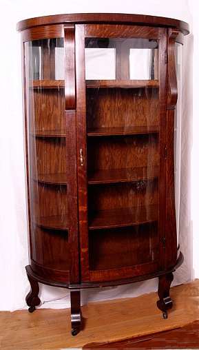 TURN OF THE CENTURY OAK BOWFRONT CHINA CABINET: 4 shelves with plate grooves, upper shelf backed with mirror. 63 1/2''h. x 36'' x 15.5''.