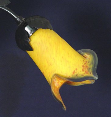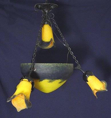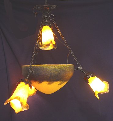 CONTEMPORARY ART GLASS CHANDELIER: Lovely chandelier with shades reminiscent of French art glass, approx. 30''dia. x 24''h.