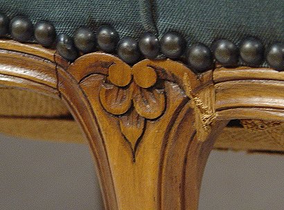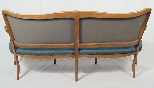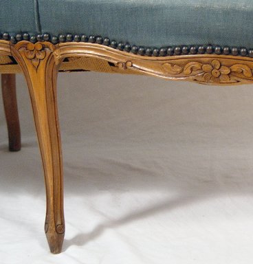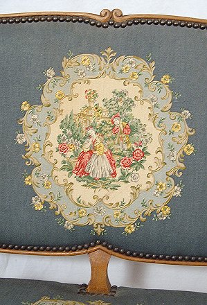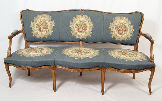 FRENCH OPEN ARM SETTEE: Carved light wood frame, upholstered in a tapestry type fabric. 5'4''l. x 33'' x 22''.
