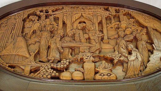 HIGHLY CARVED CHINESE TEA TABLE WITH 6 STOOLS: Deeply carved scenic center with glass top. 6 stools fit snugly under the oval table. Unusual combination of dark and light mahogany. 20''h. x 50'' x 30''. Stools are 12 1/2''h.