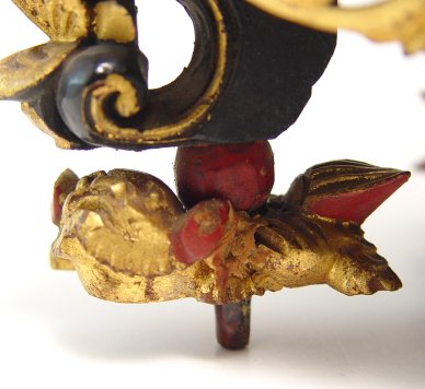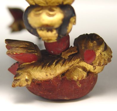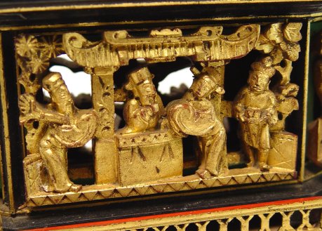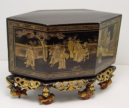 CHINESE CARVED GILT WOOD AND LACQUER BOX ON STAND: Under the six sided cover is a carved scene of figures on a stand of foo lions. Please call for condition. 10''H, X 13'' X 5 1/2''.