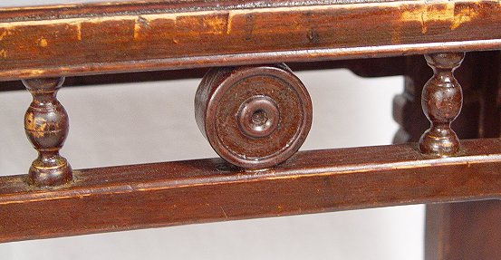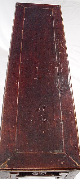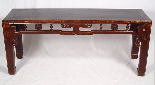 ORIENTAL BENCH OR LOW TABLE: Soft brownish red lacquer finish on subtle oriental motif bench, 44 1/4''l., 12 3/4''w., 19''h., impressed red wax seal mark, appropriate wear to wood and finish.