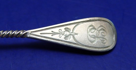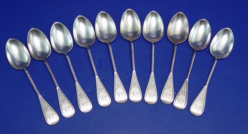 TIFFANY & CO STERLING SPOONS: Set of 10 spoons. Engraved design with a twist handle. 5 5/8''l. Monogrammed.