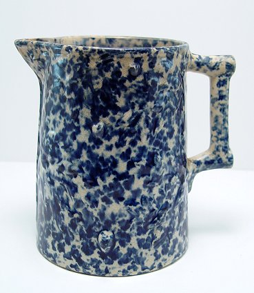 BLUE SPONGEWARE PITCHER: Under the glaze is a molded leaf and vine design. Age crackles, and hairlines in the base. 7 1/2''h.
