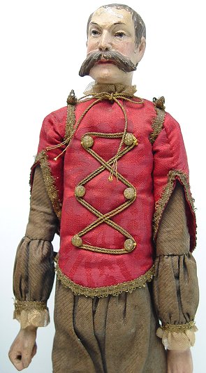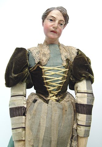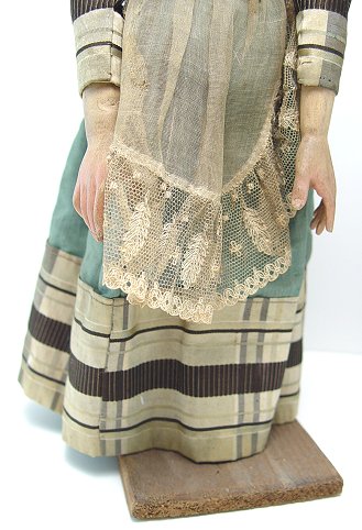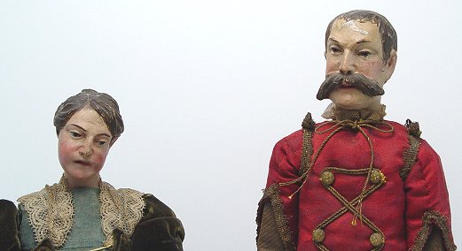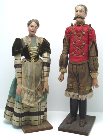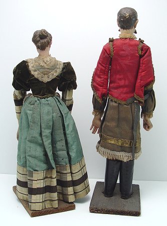 FOLK ART MAN AND WOMAN CARVED WOODEN DOLLS: In hand sewn Eastern European costume. Painted features. Clothes do look a bit worn. 13'' and 15''h.
