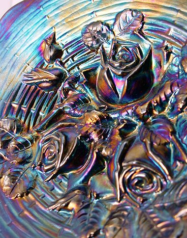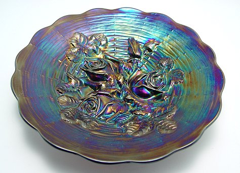 NORTHWOOD ''ROSE SHOW'' CARNIVAL GLASS BOWL: Amethyst color with the realistic roses in the interior, basket weave exterior. 9 1/2'' dia.