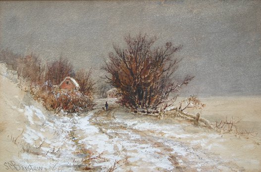 BARSTOW, Sarah, (American, 19th C.): Winter landscape with figure, W/C heightened with white, 8 1/4'' x 12 1/2'' sight, SLL, worn molding, 14'' x 18 1/2''.
