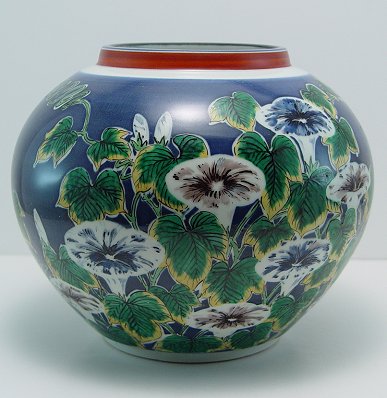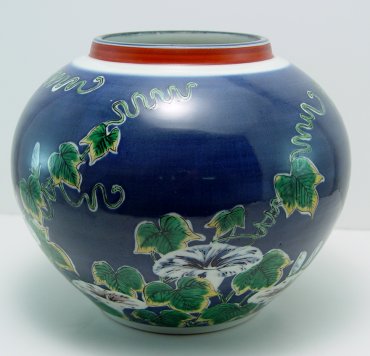 FINE JAPANESE IMARI STUDI JARDINIERE: Cobalt glaze with morning glory design. Attributed to Studi. 8''h. 10'' dia. No chips, cracks, or repairs.