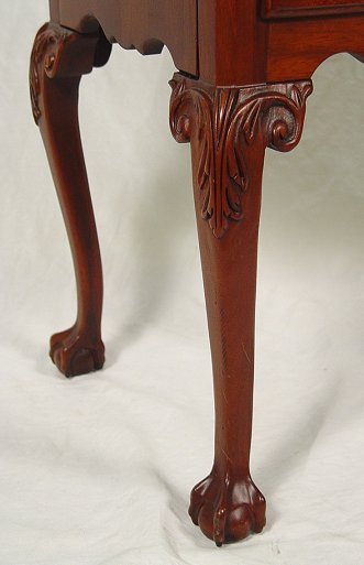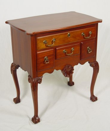 LEXINGTON CHIPPENDALE STYLE LOW BOY CHEST: Diminutive in size, not in detail. Shaped top over full length drawer, over three drawers. Centered shell carving along the skirt, raised on carved cabriole legs ending in claw and ball feet. 29''h, x 27'' x 16 3/4''.