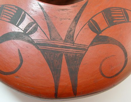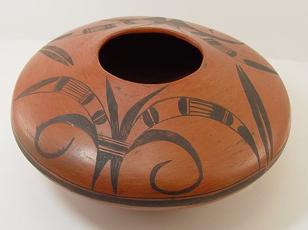 NATIVE AMERICAN INDIAN VESSEL: Strong red ochre and umber design, concave base, narrow 3 1/2'' opening, approx. 11''dia, 4 1/4''h., slight crazing to bottom, no mark noted.