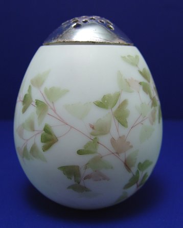 MT. WASHINGTON MUFFINEER SUGAR SHAKER: In the hand painted Maidenhair Fern design. Flat-end egg shaped. 4 1/2''h.