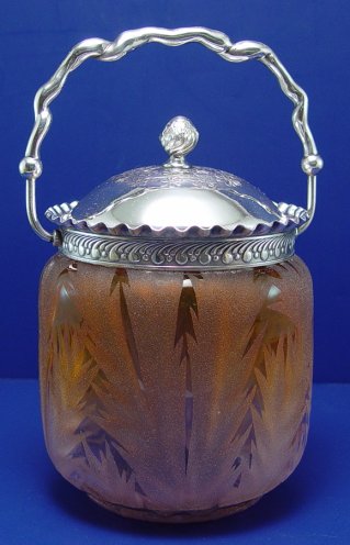 MT WASHINGTON FERN ETCHED BISCUIT JAR: Etched glass in a blush of amberina. Silverplated handle and lid signed MW. 7 1/2''h., x 5'' dia. Excellent condition.