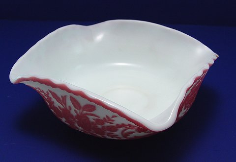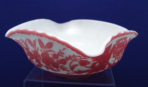 MT. WASHINGTON CAMEO GLASS BOWL: Griffin design, pink over white. 6 3/4'' dia. 3''h. Please note small discoloration along the exterior rim.