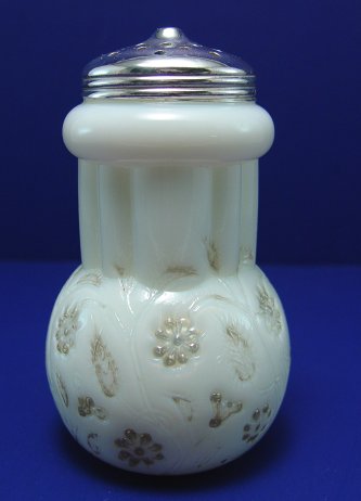 FINDLAY ONYX MUFFINEER SUGAR SHAKER: Dalzell, Gilmore & Leighton, makers of ''Findlay Onyx'' closed it doors in 1903. Opaque onyx glass shaker 5 1/4''h.