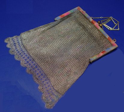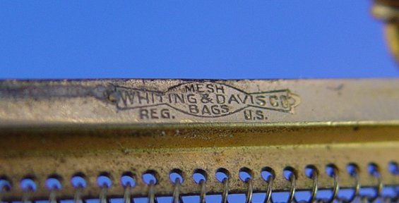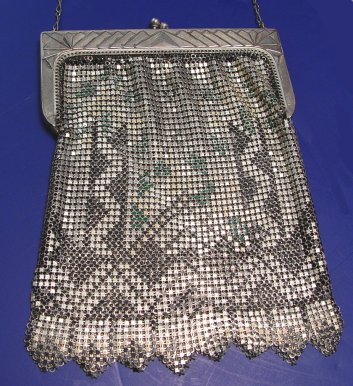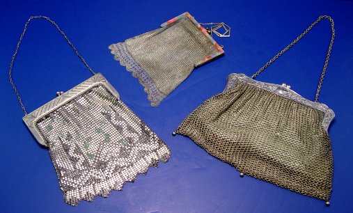 GROUP OF VINTAGE PURSES: To include, German Silver and Whiting & Davis. German bag with embossed frame in a fruited grape vine pattern, metal mesh outer bag with three small dangling balls, covers leather? inner purse with small inner pocket. Approx. 6 3/8'' x 6 1/2'' plus chain, marked GermanSilver. Whiting & Davis to include, psychedelic polychrome applied decoration, worn from mesh but still on frame, 4'' x 6'', plus chain, marked on inside of frame. Whiting & Davis enameled mesh bag in a geometric pattern, slight separation of frame from mesh at hinge. 5'' x 7 1/2'' plus chain, marked with tag.