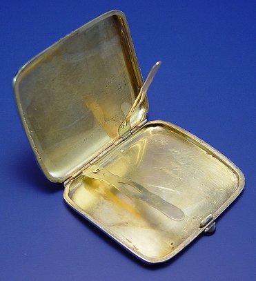 TIFFANY & Co STERLING CIGARETTE/CARD CASE: Under the sea feel to this lovely slightly curved case, monogrammed to front and dated 1905 to back, marked interior rim ''Tiffany & Co 14445 Makers 461 Sterling 925-1000 C'', flip support bars, one with slight bend, inner support bar of pressure clasp rusty making amethyst cabochon button slightly difficult to use. 3 5/8'' x 3 1/8'' Normal 100 year old wear noted including slightly deeper line across back cover.