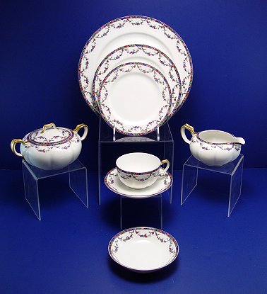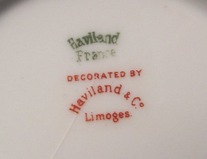 FRENCH HAVILAND LIMOGES ''PURITAN'' FINE CHINA SERVICE: CA. 1876-1930. 61 piece service for 10 shy two cups. Includes 10 each of dinner plates, salad plates, berry bowls, 13 bread plates, 8 cups and saucers. Plenty of serving pieces to include gravy with underplate, covered vegetable, 2 open vegetable, 3 pierced handle serving bowls, relish tray, creamer and covered sugar.