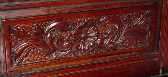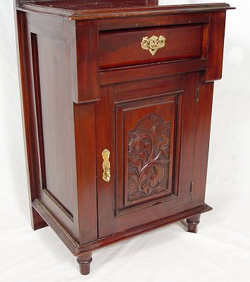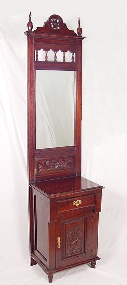 MAHOGANY FOYER STAND WITH MIRROR: 7' tall mahogany stand with carved crest centered by finials. One drawer over one door. 19 3/4''w. x 17''.