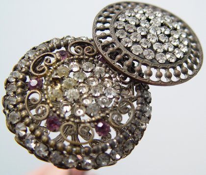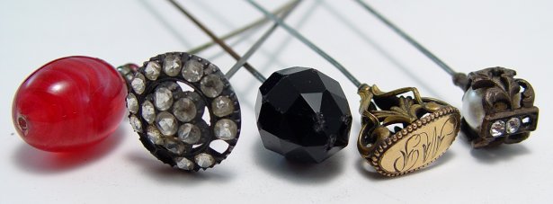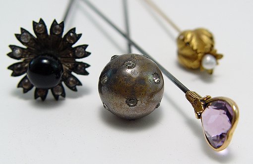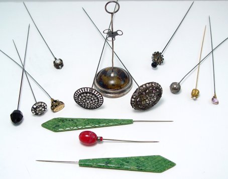 VINTAGE HAT PIN COLLECTION: Collection of 13 hat pins to include, heart shaped amethyst set in 14k yellow gold, 8 1/4''l.; 14k leaf and fresh water pearl, 7 1/8''; silver ball set with rhinestones, 8 3/4''l.; converted watch fob, 8 3/4''l.; round disk set with rhinestones, 10 3/4''; round disk set with purple and white rhinestones, some missing, 10 5/8''; small round disk with rhinestones, 3 missing, 7''l.; faux pearl, 7 7/8''l.; faceted black glass beads, 8 7/8''; black bead in a floral backing, 8''l.; red bead, 4''l.; pair of green plastic with hatch mark design 7 1/4''l. each. Sold with purple velvet case that holds four and a Birmingham sterling stand with tortoise shell? trim, purpose unknown, 5 3/4''h.