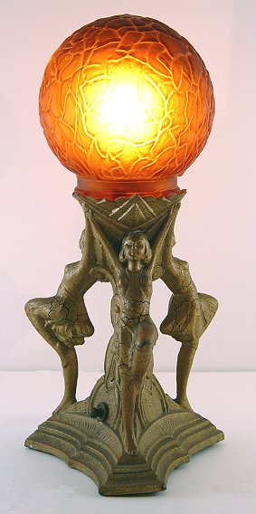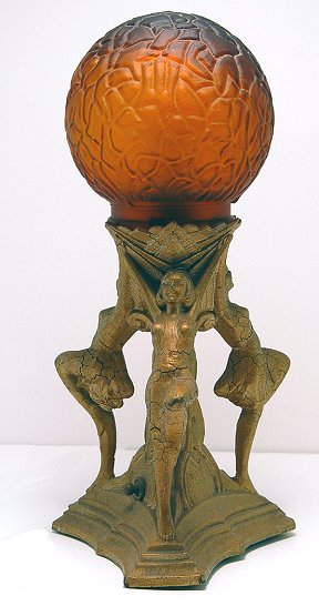 ART DECO FIGURAL LAMP: Trio of dancers supporting amber glass globe shade. Gold crackled finish on the metal base. 13 1/2''h. shade has a 3'' rim. No makers marks.