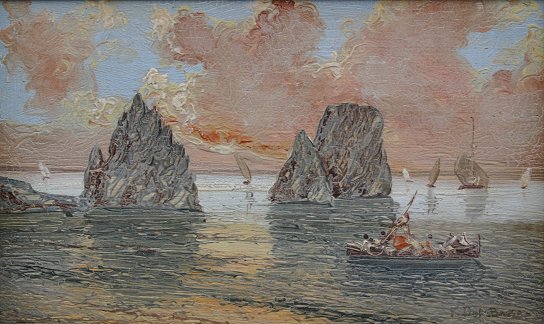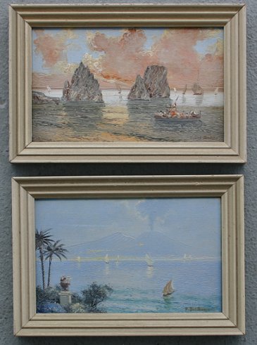 DEL BASSO, Fernando, (Italian, 20th C.): Pair of Italian Coastal scenes, one of the Bay of Naples with Vesuvius, and the other of Capri, O/B's, 4 3/8'' x 6 1/4'', SLR, signed and stamped verso with studio address, original frames.