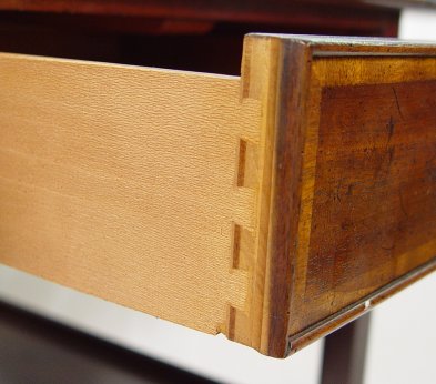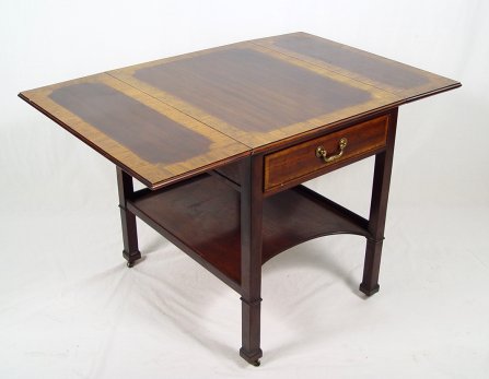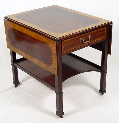 HENREDON PEMBROKE TABLE: Banded mahogany double drop leaf side table, single drawer over scooped lower shelf, 27'' x 21''w. plus two 10''leaves, 26''h.